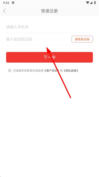 4、在快速注冊頁面,輸入手機號和短信驗證碼,勾選同意協(xié)議后點擊下一步按鈕完成注冊。