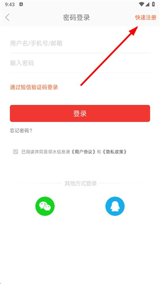 3、在登錄頁面,點擊右上角快速注冊選項,進入快速注冊頁面。