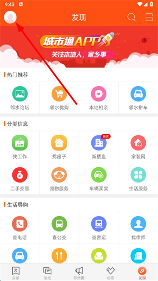 1、打開鄰水信息港app,點擊左上角頭像區(qū)域,進入我的頁面。