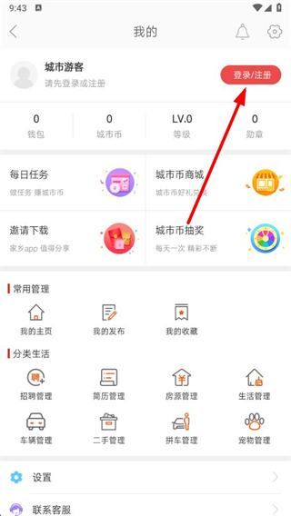 2、在“我的”頁面,點擊登錄注冊按鈕,進入登錄頁面。