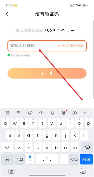 2、進入到驗證頁面中,在輸入框中填寫獲取到的驗證碼后,可以進入下一步。