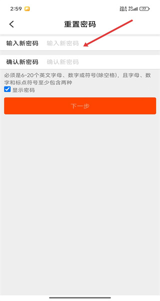 4、在進入到重置密碼頁面中,點擊輸入框即可進行密碼的重置,再點擊下一步即可完成找回操作。