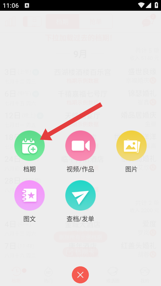 2、在功能選擇菜單中,點(diǎn)擊檔期圖標(biāo),進(jìn)入檔期類型選擇頁面。