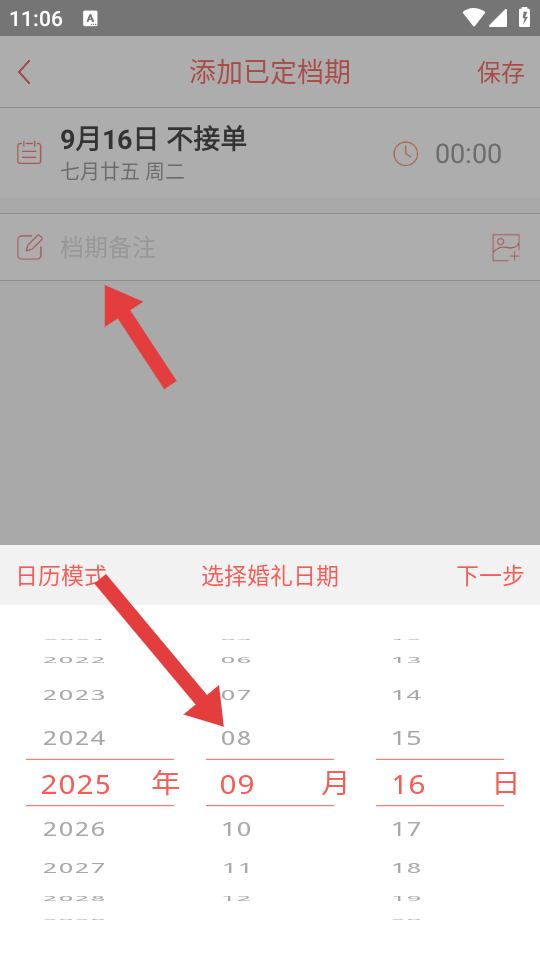 4、在頁面選擇婚禮日期,填寫檔期備注等信息后,點(diǎn)擊右上角保存完成添加。