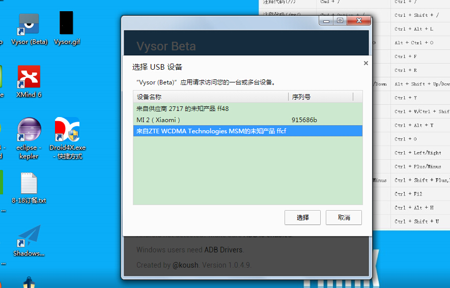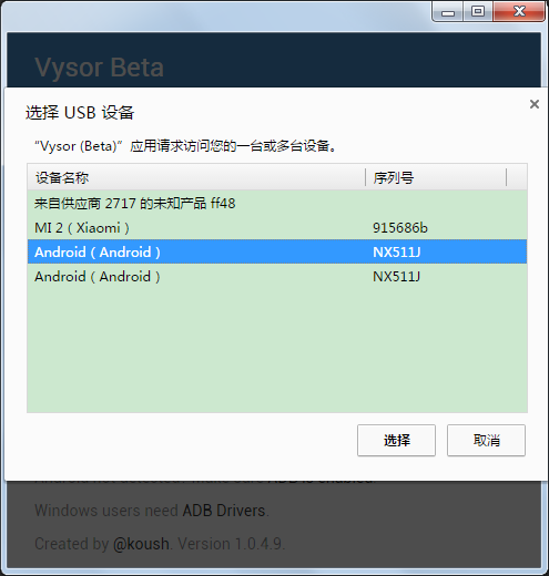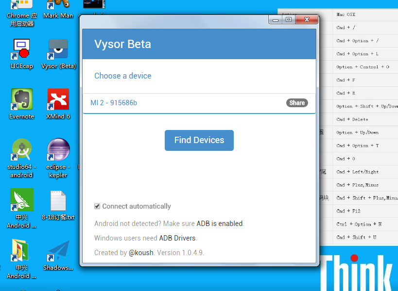 裝完插件,點(diǎn)啟動(dòng)應(yīng)用,Vysor 就出來(lái)啦,瞅瞅它的小模樣,不同平臺(tái)可能會(huì)不一樣(win和mac一個(gè)屌樣,已連過(guò)小米2s的圖)。
