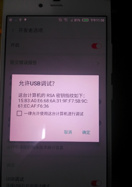 如果你手機(jī)提示下面對(duì)話框,果斷ok,允許設(shè)備USB調(diào)試。如果不小心點(diǎn)了取消,就拔下來(lái)重插一下usb。