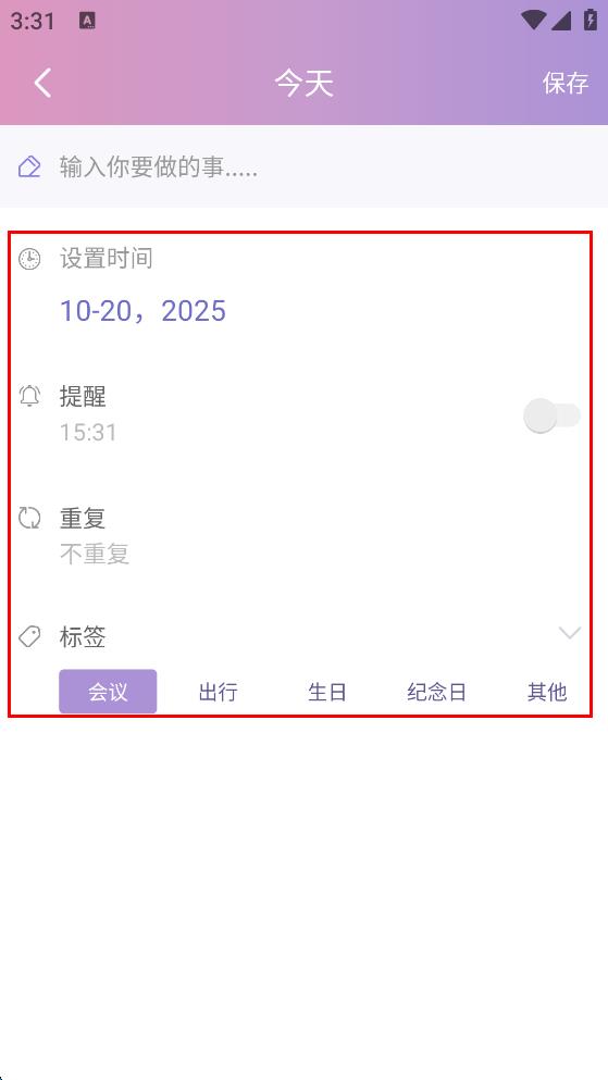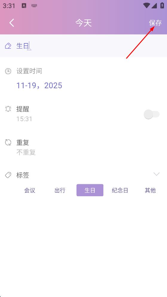 2、進入添加日程頁面,在輸入框輸入要做的事,設(shè)置時間、提醒、重復(fù)等信息,選擇合適標簽。