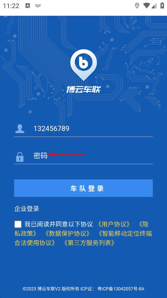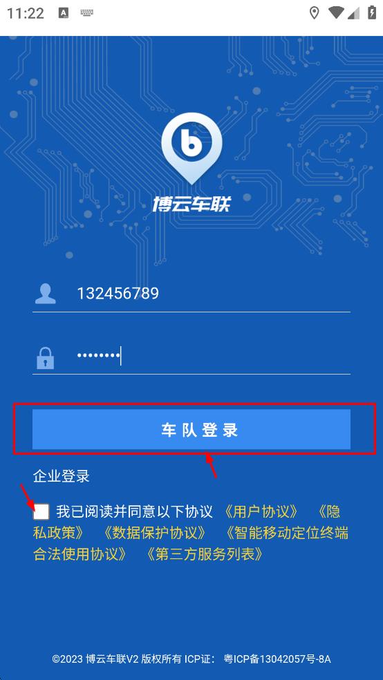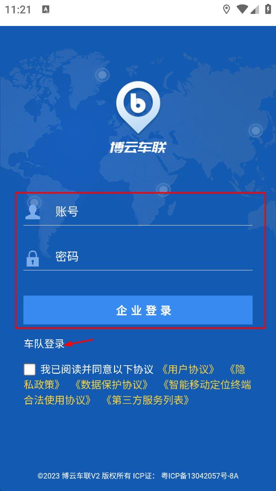 4、密碼輸入完成后,閱讀各項協(xié)議后點擊同意,然后點擊“車隊登錄”按鈕,完成車隊登錄。