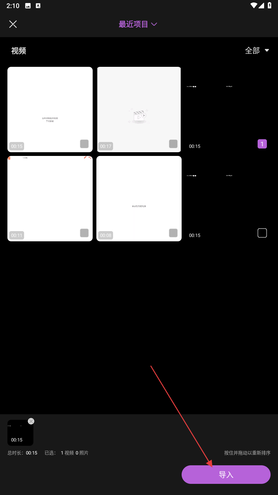 2、進入視頻選擇的頁面內,選擇后點擊導入的按鈕。