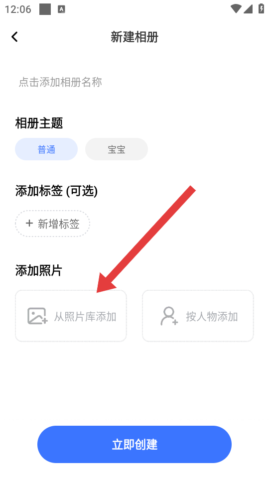3、在新建相冊的頁面,點(diǎn)擊從照片庫添加選項(xiàng),進(jìn)入手機(jī)照片選擇界面。