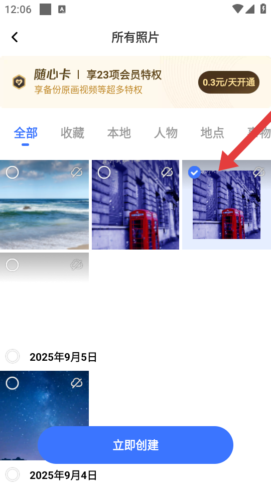 4、在所有照片頁面,勾選需要導(dǎo)入的照片后點(diǎn)擊創(chuàng)建,將手機(jī)相冊中的照片導(dǎo)入一刻相冊。