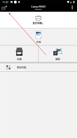1、打開佳能移動(dòng)打印APP,點(diǎn)擊界面左上角的添加打印機(jī)圖標(biāo),進(jìn)入選擇打印機(jī)頁面。