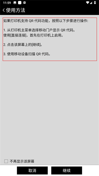 5、選擇QR代碼方式后,按照提示使用移動(dòng)設(shè)備掃描打印機(jī)顯示的QR代碼。