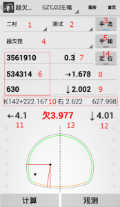 進(jìn)入隧道超欠挖界面,可以看到斷面類(lèi)型、斷面、結(jié)構(gòu)點(diǎn)選擇、實(shí)測(cè)坐標(biāo)、結(jié)構(gòu)點(diǎn)指引等選項(xiàng)
