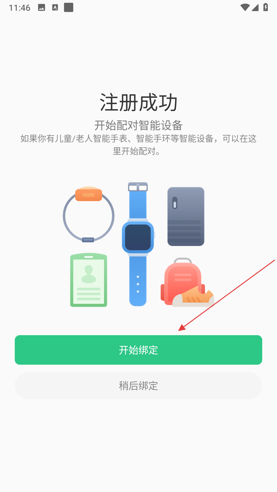 1、打開安全守護APP,注冊成功之后點擊開始綁定按鈕,進入設(shè)備類型選擇頁面。