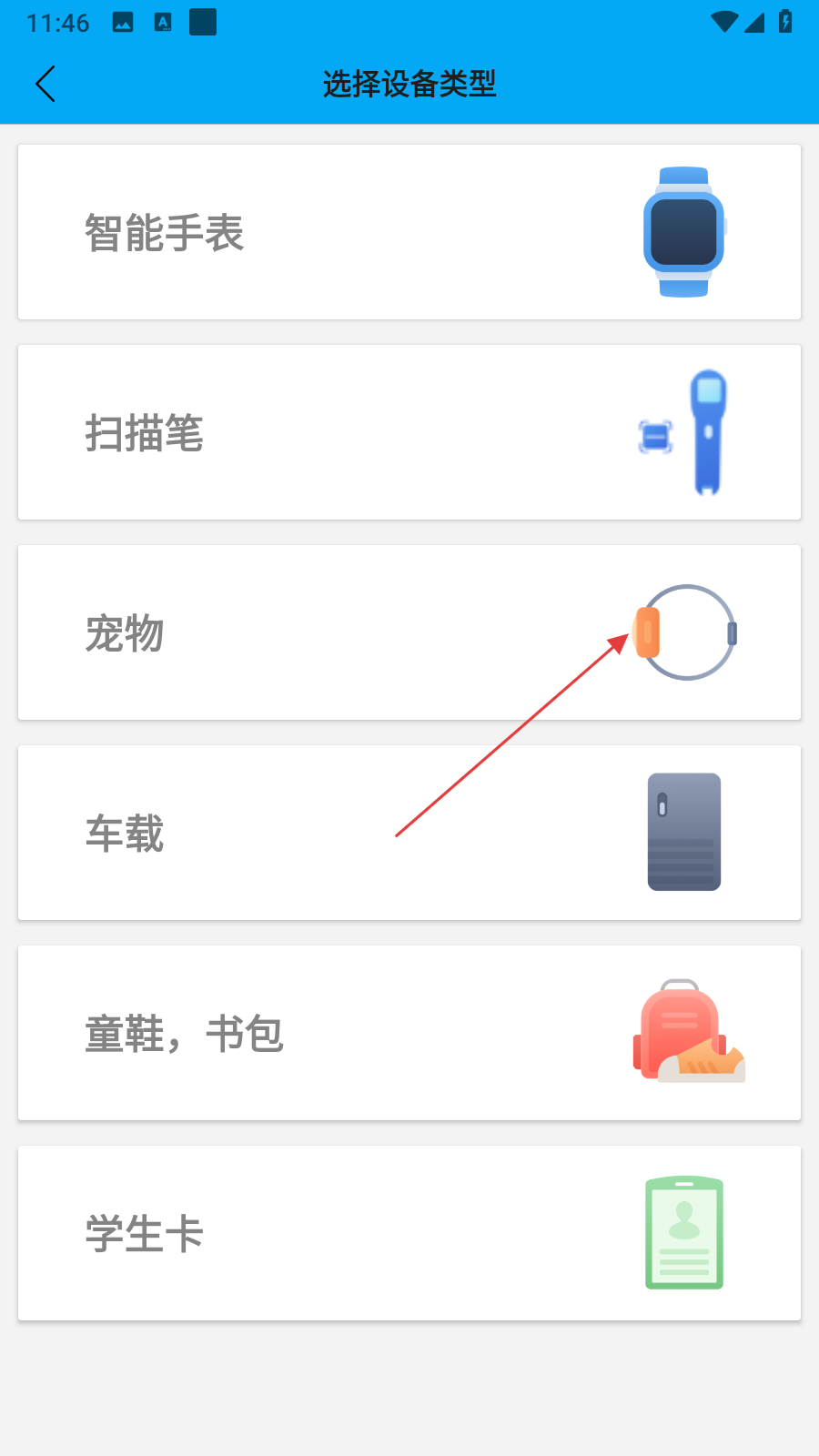 2、在選擇設(shè)備類型頁面,點擊寵物選項,進入添加寵物設(shè)備的詳情頁面。