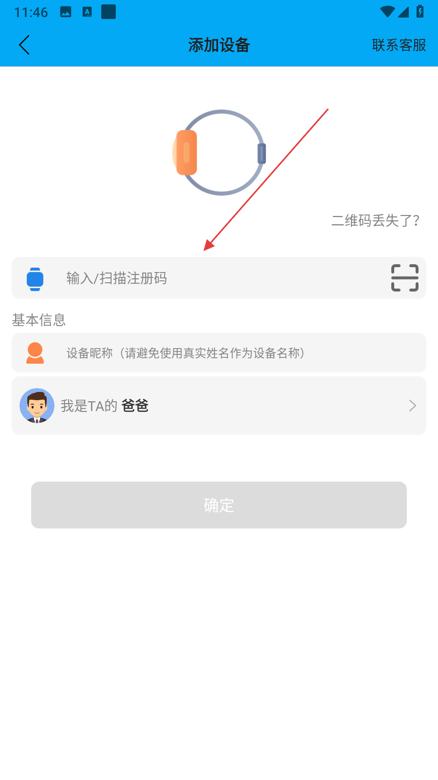 3、在添加設(shè)備頁面,點擊輸入/掃描注冊碼欄,輸入寵物設(shè)備機身的注冊碼,接著設(shè)置設(shè)備昵稱,并選擇與寵物的關(guān)系,確認信息無誤后,點擊確定按鈕。