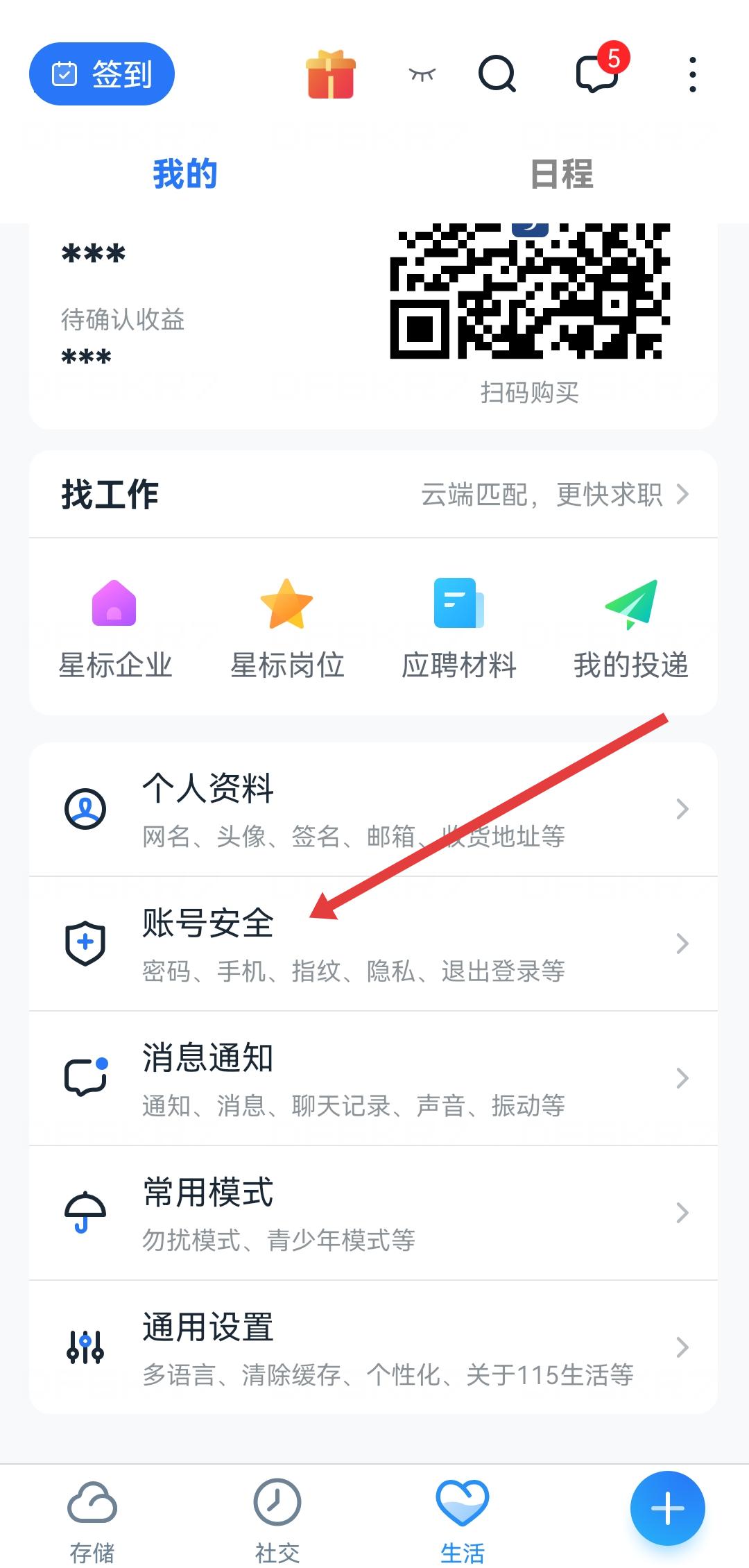 1、打開115生活A(yù)PP,進入我的頁面,點擊賬號安全選項,進入賬號安全設(shè)置界面。