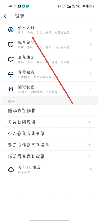2、在設(shè)置頁面點擊個人資料選項,進入資料頁面。