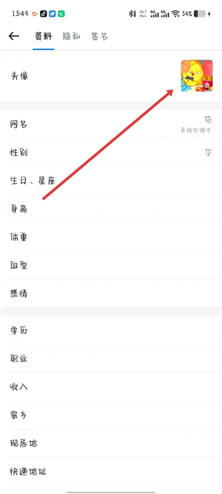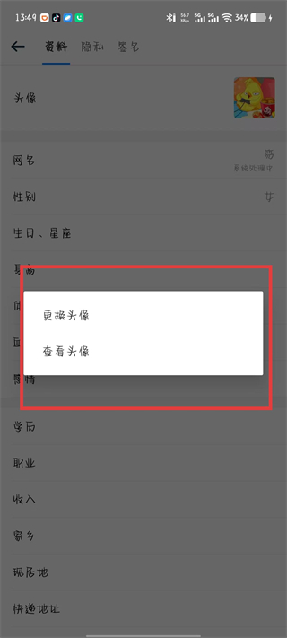 3、進入資料頁面之后,找到并點擊頭像,彈出選項框。
