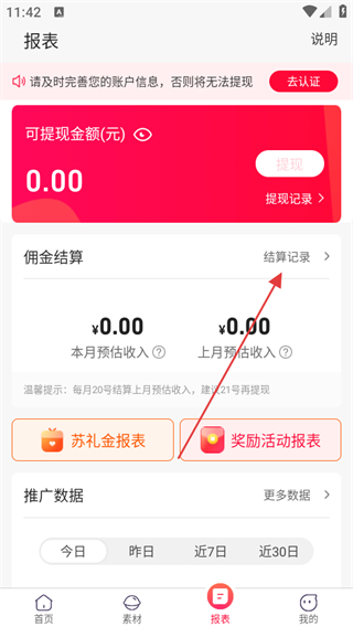 2、在報表頁面,找到傭金結算板塊,點擊其右側的結算記錄選項。