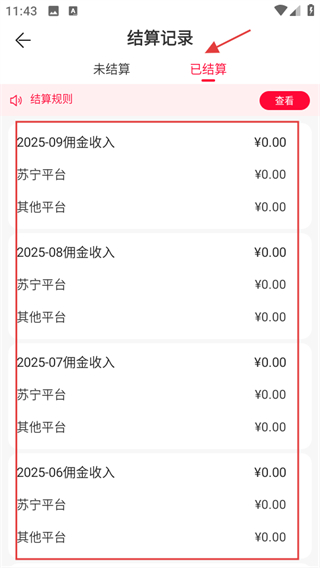 4、點擊已結算選項卡,能查看不同月份平臺及其他平臺的已結算傭金收入記錄。