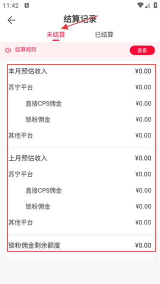 3、進入結算記錄頁面,可查看未結算狀態(tài)下的本月預估收入、上月預估收入等相關結算數(shù)據(jù)。