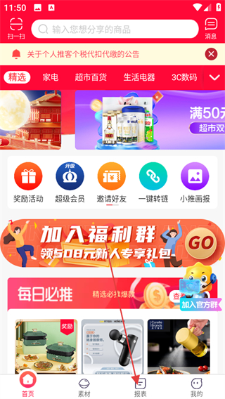 1、打開蘇寧推客APP,進入首頁后,點擊底部導航欄中的報表選項。