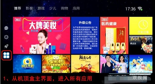 1、從機(jī)頂盒主界面,進(jìn)入所有應(yīng)用,如下圖: