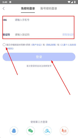 3、在登錄頁(yè)面,輸入手機(jī)號(hào)、驗(yàn)證碼,勾選用戶協(xié)議和隱私政策,點(diǎn)擊登錄。