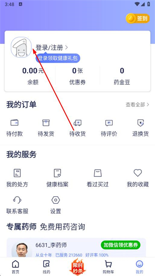 1、打開1藥網(wǎng)app,進(jìn)入首頁(yè),點(diǎn)擊底部導(dǎo)航欄中的我的選項(xiàng)。