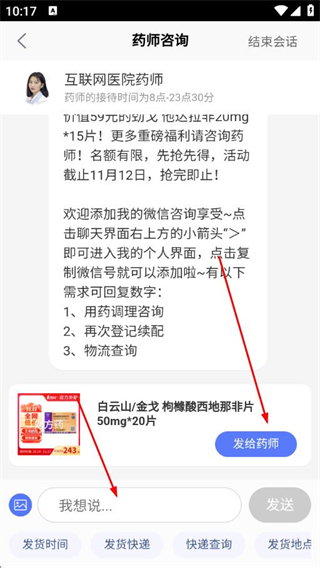 3、點(diǎn)擊發(fā)給藥師按鈕發(fā)送藥品信息,輸入用藥問(wèn)題,點(diǎn)擊發(fā)送向藥師咨詢。