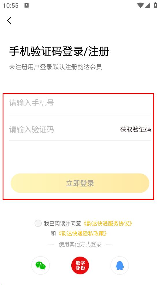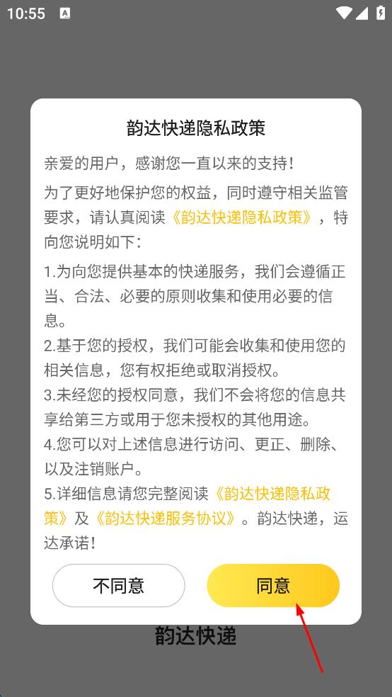 1、打開韻達快遞APP,在彈出的韻達快遞隱私政策提示框中,點擊“同意”按鈕。