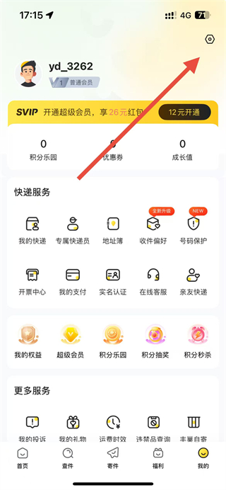 1、打開韻達快遞APP,在我的頁面點擊右上角設(shè)置圖標,進入設(shè)置界面。
