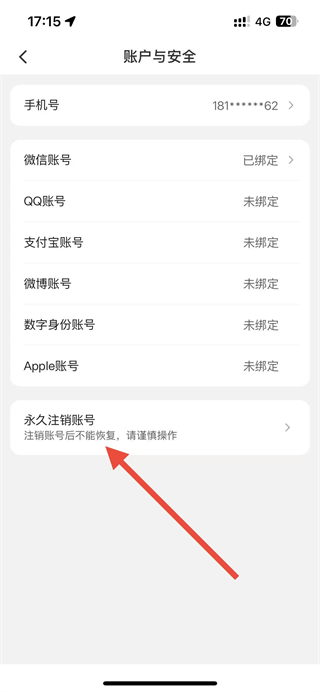 4、在賬戶與安全頁面,點擊永久注銷賬號選項,按照提示操作即可完成賬號注銷。