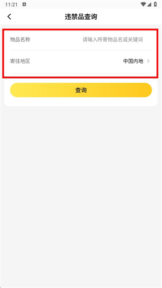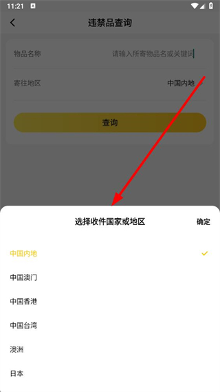 4、確認寄往地區(qū)信息后,點擊查詢按鈕,即可獲取該物品是否屬于違禁品的相關(guān)結(jié)果。