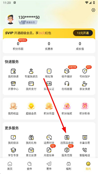 2、進入對應(yīng)界面后,在更多服務(wù)區(qū)域找到違禁品查詢選項并點擊。