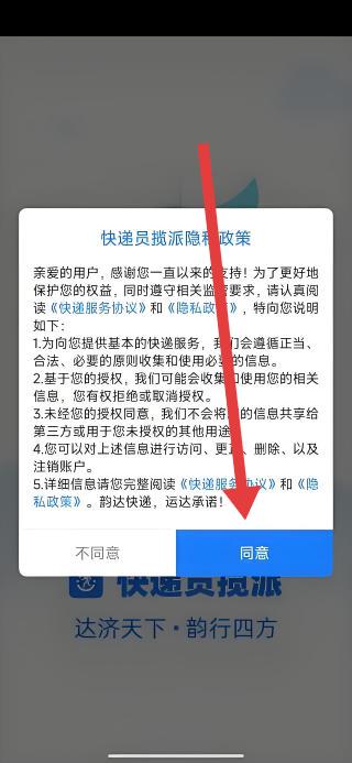 1、在快遞員攬派隱私政策彈窗中,點擊同意按鈕,接受服務(wù)協(xié)議與隱私政策,進入應(yīng)用流程。