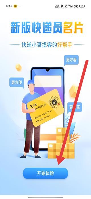 2、在新版快遞員名片引導(dǎo)頁,可以按照箭頭指示點擊開始體驗按鈕,隨即跳轉(zhuǎn)至登錄界面。