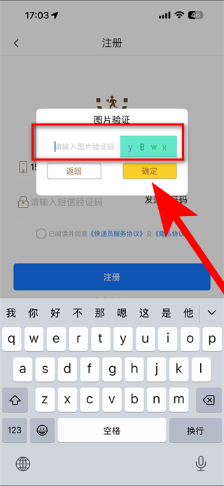 2、在注冊界面輸入手機號碼,點擊發(fā)送驗證碼,完成圖片驗證如輸入yBwx后點擊確定。