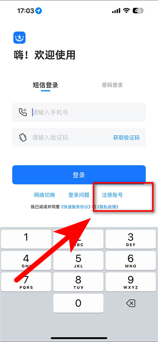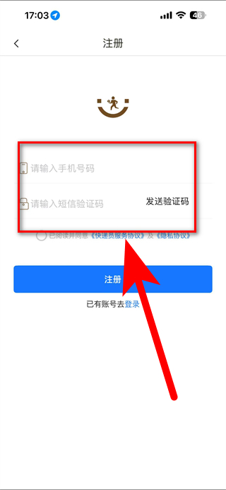 1、打開韻達業(yè)務(wù)員APP,在登錄頁面點擊注冊賬號,進入注冊界面。