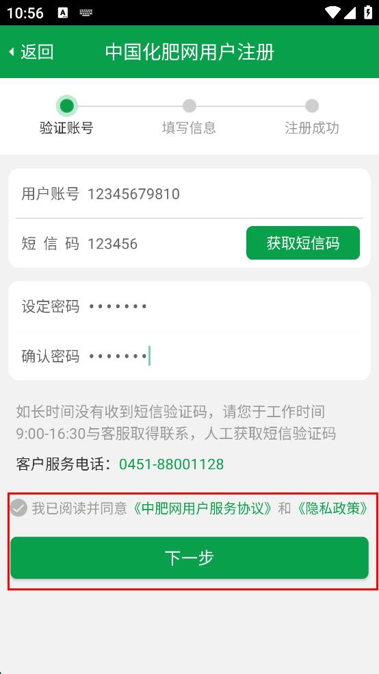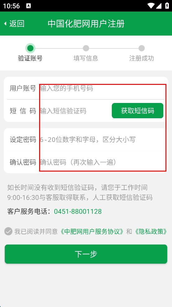 4、勾選我已閱讀并同意中肥網(wǎng)用戶服務(wù)協(xié)議和隱私政策,然后點擊“下一步”按鈕,進(jìn)行后續(xù)注冊流程。