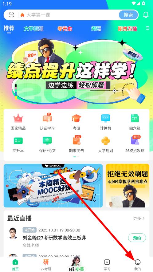 1、打開中國大學(xué)moocAPP,在首頁點擊我的進入個人界面。