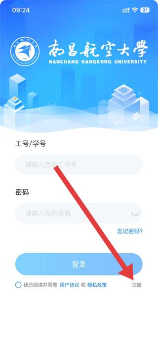 1、打開南昌航空大學(xué)app,點擊右下角的注冊選項。