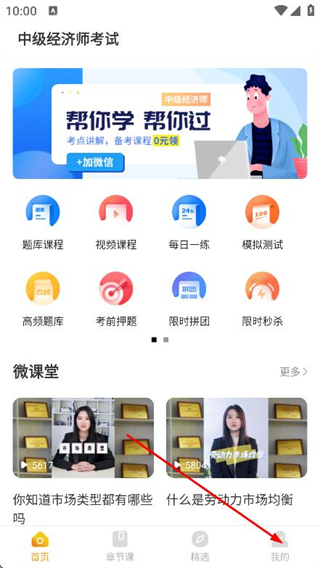 1、打開經(jīng)濟(jì)師app,點(diǎn)擊底部導(dǎo)航欄中的我的選項(xiàng)。