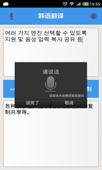 韓語翻譯軟件是國內(nèi)最實用最簡潔最省電的中韓文翻譯軟件!提供翻譯結(jié)果分享功能,可以將翻譯結(jié)果通過短信等多種渠道分享給其他用戶,提供翻譯結(jié)果復制功能等功能。是一個功能強大的韓語在線翻譯工具。