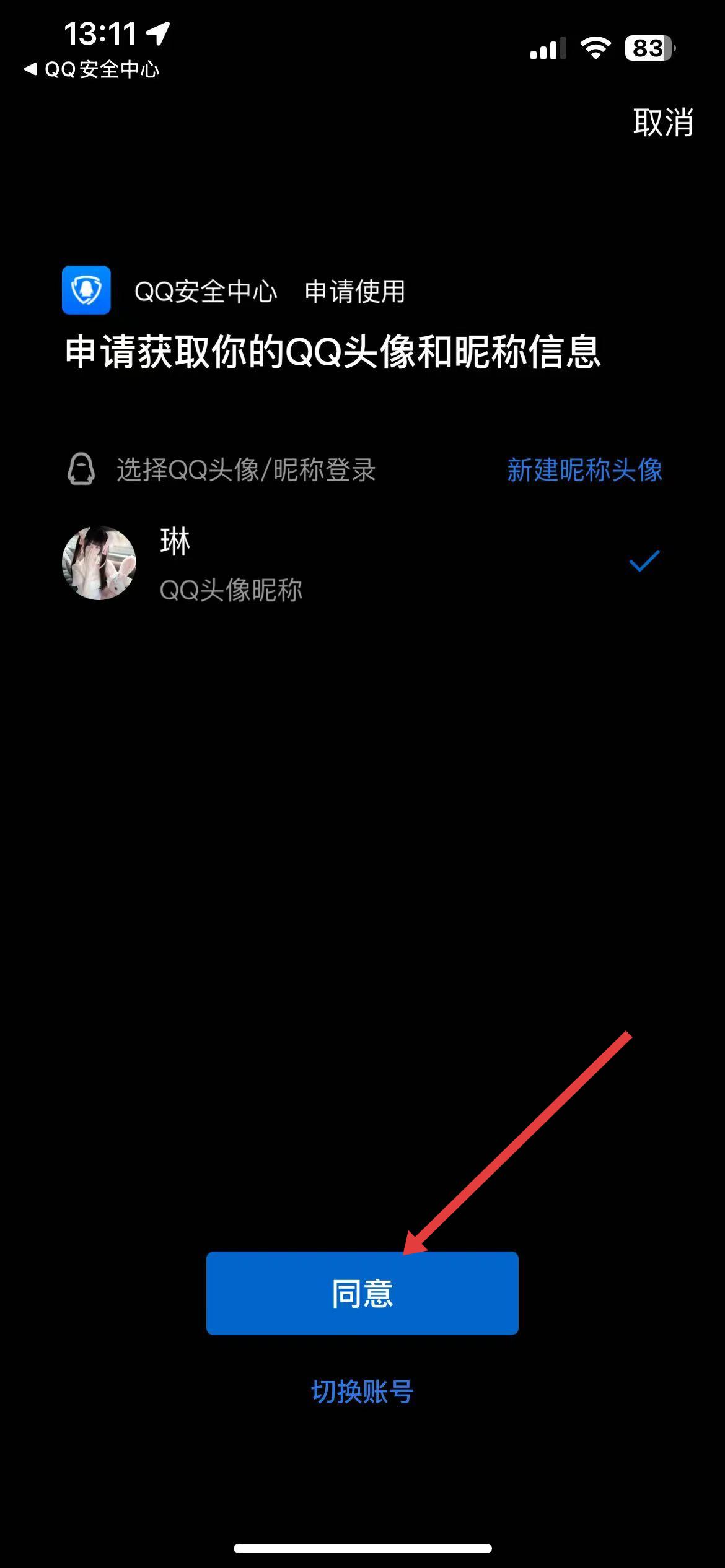 4、在彈出的申請獲取信息界面中,選擇要登錄的QQ,點擊同意,即可綁定其他QQ賬號。