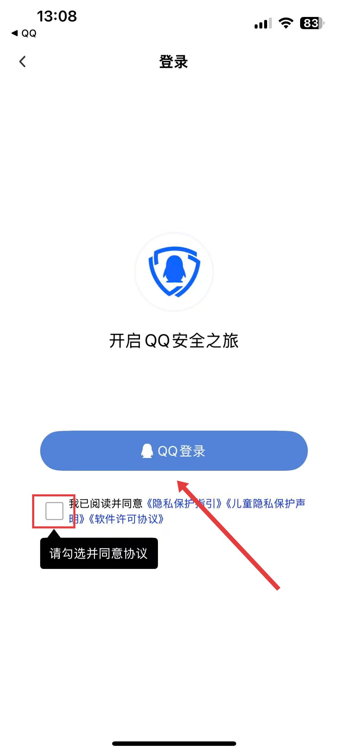 3、進入登錄界面,勾選我已閱讀并同意相關(guān)協(xié)議,然后點擊QQ登錄。