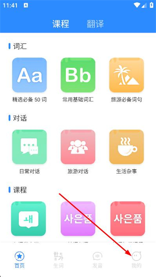 1、打開(kāi)韓語(yǔ)學(xué)習(xí)神器app,點(diǎn)擊底部導(dǎo)航欄我的選項(xiàng)。