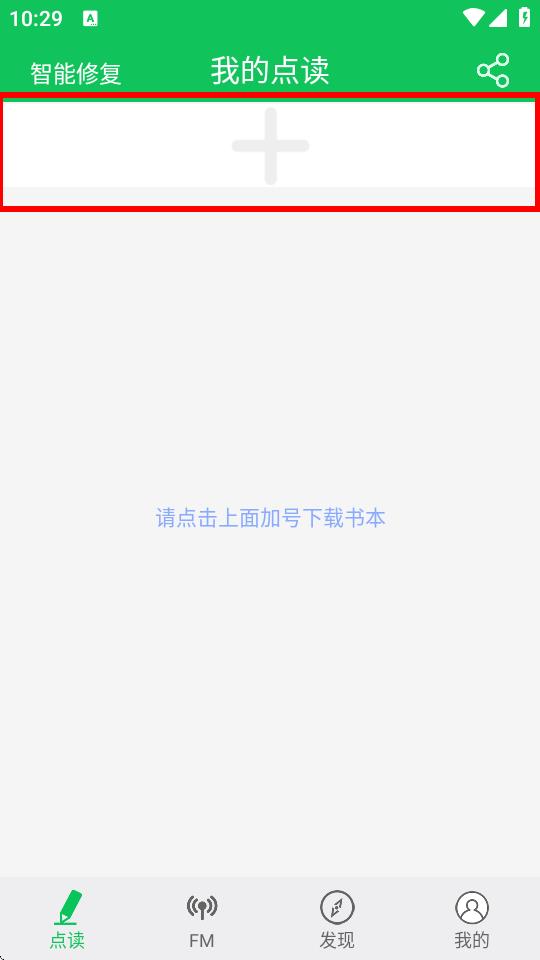 1、進(jìn)入我的點讀頁面,點擊上方+號圖標(biāo)準(zhǔn)備下載書本。